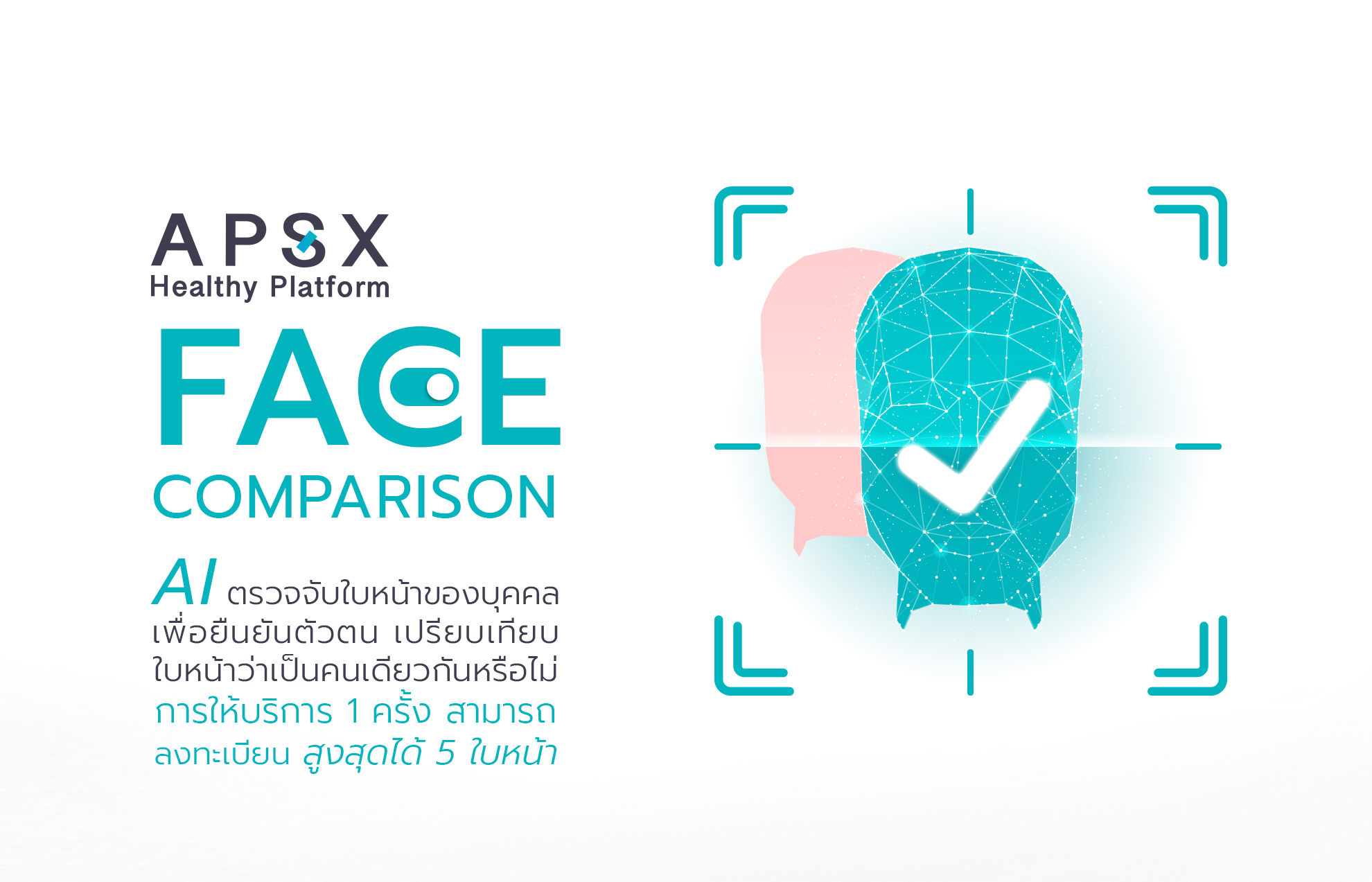 Ai ตรวจจับใบหน้า เพื่อยืนยันตัวตนAi ตรวจจับใบหน้าของบุคลเพื่อยืนยันตัวตน เปรียบเทียบใบหน้าว่าคนเดียวกันหรือไม่ การให้บริการ 1 ครั้ง สามารถลงทะเบียน สูงสุด 5 ใบหนน้า