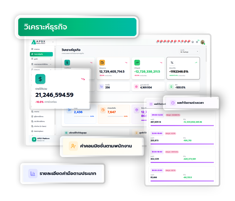 APSX Platform ออกแบบมาเพื่อช่วยเจ้าของธุรกิจจัดการบริหารงาน ได้อย่างลงตัว ระบบครอบคลุมทุกด้านของธุรกิจ ไม่ว่าจะเป็นการจัดการระบบภายใน การเงิน การตลาด การขาย สต๊อก ค่าใช้จ่าย ค่าคอมมิชชั่น และอื่นๆ ครบจบในแพลตฟอร์มเดียว