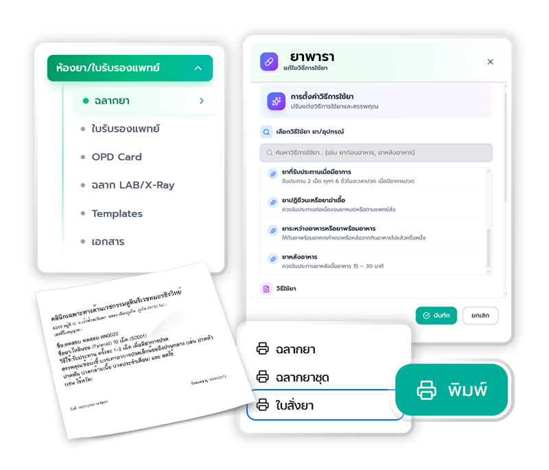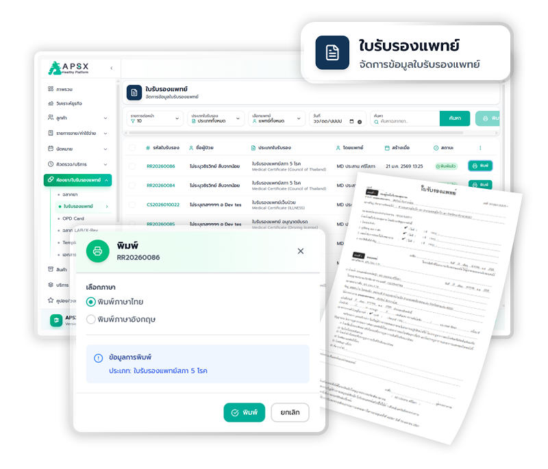 รองรับเทมเพลตมาตรฐาน (ใบรับรองทั่วไป, ใบตรวจรักษา, และใบส่งตัว)