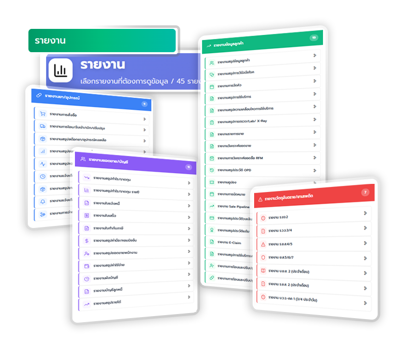 ระบบรายงานที่ครบครันและหลากหลาย ตอบโจทย์ทุกมิติการบริหารงาน ตั้งแต่รายงานด้านการเงิน บัญชี การให้บริการ คลังยา ไปจนถึงการตลาด Export เป็น Excel/PDF ได้ทันที ช่วยให้คุณตัดสินใจได้อย่างรวดเร็วและแม่นยำ